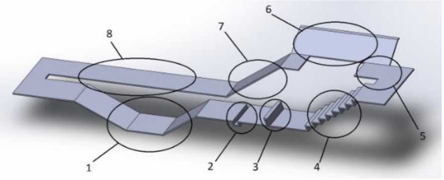 Рис. 3. Виртуальный полигон: 1 – ров (угол спуска и подъема 30°); 2 – открытый водосток; 3 – бордюр; 4 – лестница; 5 – лифтовая зона (разворот на месте); 6 – косогор 30°; 7 – спуск 30°; 8 – участок разгона-торможения