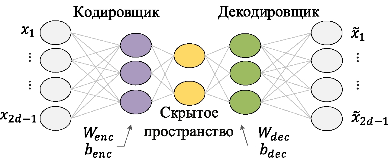 Автокодировщик состоит из двух частей (рис. 2): кодировщика и декодировщика. Кодировщик отвечает за сжатие входа в скрытое пространство и представлен функцией кодирования Декодирировщик предназначен для восстановления входа из скрытого пространства и представлен функцией декодирования Размерности векторов x и совпадают, размерность вектора z меньше размерности x. Таким образом,