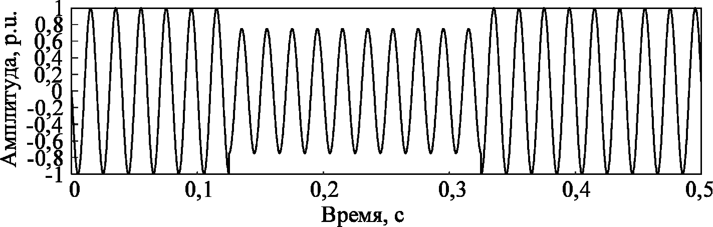 Сигнал напряжения u(n) с провалом 15 % показан на рис. 3. Падение напряжения происходит с момента 0,12525 сек до 0,32500 сек. Амплитуда показана в относительных единицах к номинальному уровню напряжения и обозначена по международным правилам как «p.u.» (per unit).