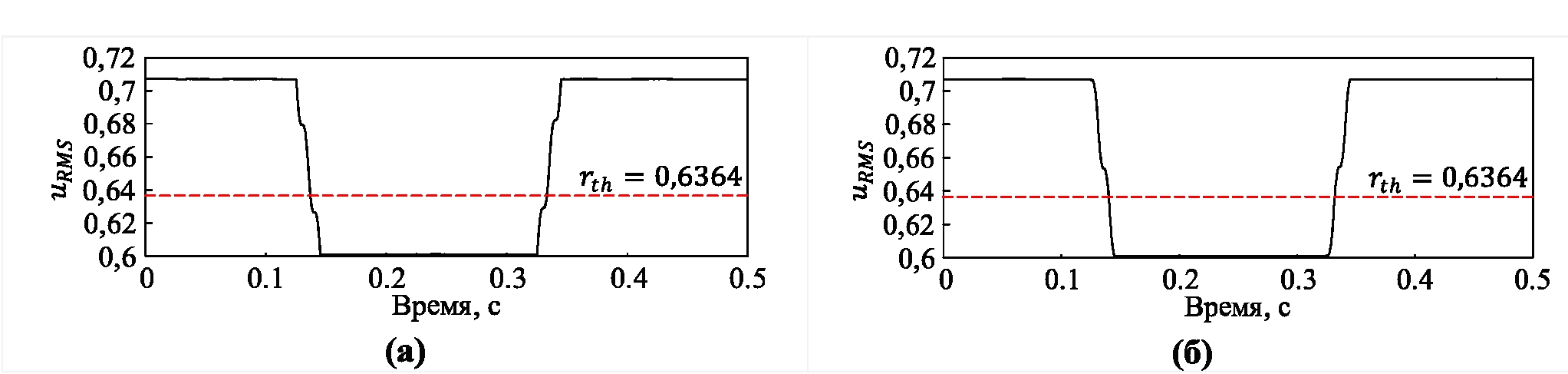 Результат обнаружения сигнала напряжения с провалом 15 % методом RMS с окном в 1 период и шагом перемещения 1 показан на рис. 4. RMS нормального напряжения составляет 0,7071. Когда RMS ниже порогового значения rth= 0,634, считается, что обнаружено провала напряжения на 15 %.