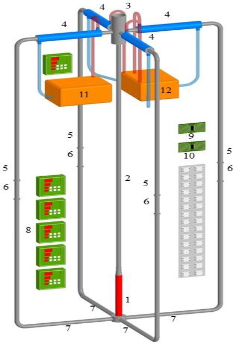 Fig. 1. Test bench diagram: 1 – fuel assembly simulator; 2 – ascending line; 3 – upper tank; 4 – heat exchangers; 5 – descending loops; 6 – sections for connecting measuring systems; 7 – horizontal sections; 8 – TRM-138 measuring and control devices; 9 – controllers; 10 – controlled relay system; 11, 12 – tanks with second-circuit coolant