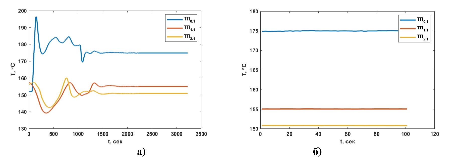Основные эксперименты были проведены в двух- и четырехпетлевых режимах работы циркуляционного контура. Так, на рис. 3 показано изменение температуры на входе и выходе из источника тепла, при работе двух петель, энерговыделение составляло 1,8 кВт. После включения тепловыделения примерно 25 мин наблюдается колебательный процесс, связанный с формированием течения свинцово-висмутового теплоносителя, после чего работа контура стабилизируется. Поток теплоносителя разделяется после расширительного бака, проходит через теплообменники стока тепла и попадает в нисходящие линии. Температура в каждой нисходящей линии становится ниже, чем на выходе из источника тепла. Температуры в обеих нисходящих линиях практически одинаковы (рис. 3). При установившемся режиме естественной циркуляции температура на выходе из модели ТВС составляет 174 °C, на входах в источник тепла колеблется в диапазоне 152-154 °C (рис. 3б).