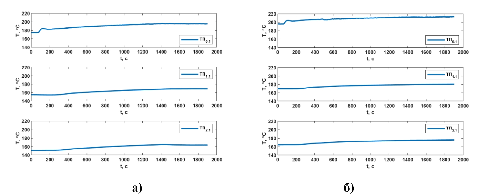 Рис. 4. Тестирование двухпетлевой конфигурации контура, режимы включения тепловыделения и выхода на стационарное состояние ЕЦ: Подводимая мощность: а) 2,7 кВт, б) 3,6 кВт