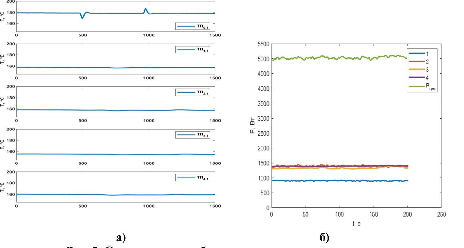 Рис. 5. Стационарная работа четырехпетлевого контура: а) температуры теплоносителя на выходе и входе в модель ТВС, подводимая мощность 3,6 кВт; б) мощность, снимаемая с каждой петли и суммарная отводимая мощность, подводимая мощность 5 кВт