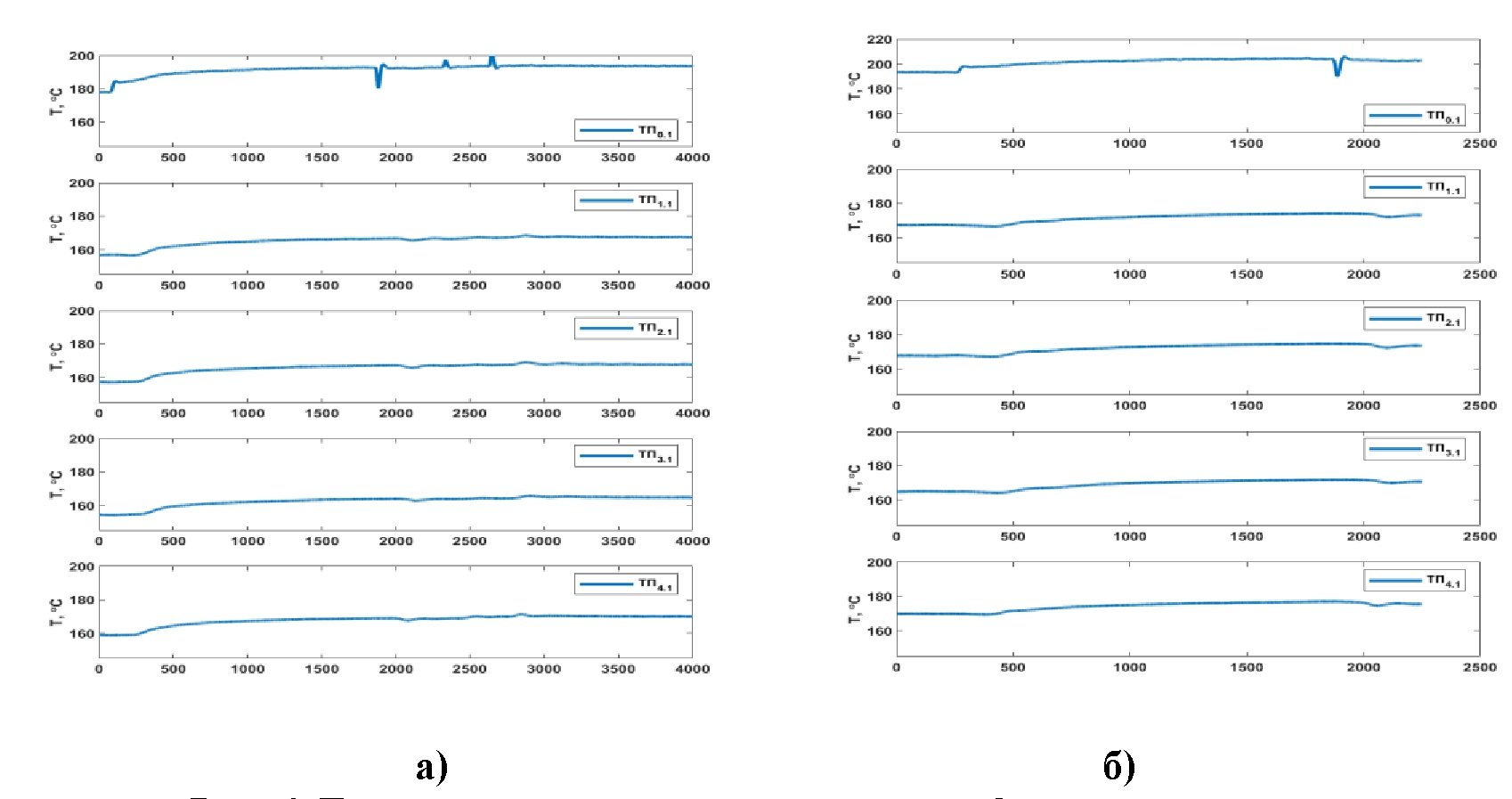 Fig. 6. Testing of the four-loop circuit configuration, modes of switching on heat release and reaching the steady state of the natural circulation: supplied power: a) 5 kW, b) 6.4 kW