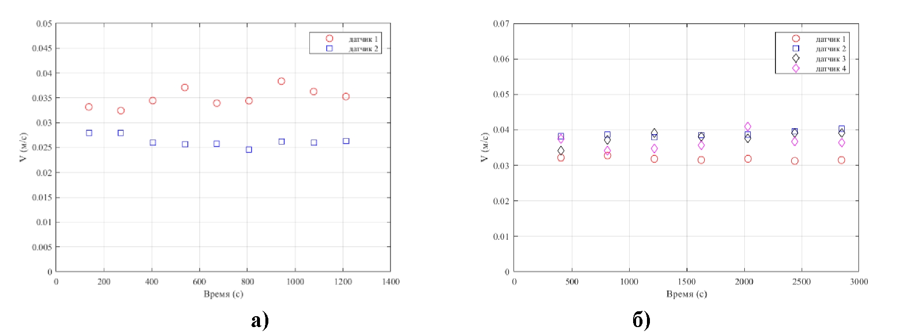 Рис. 7. Скорости теплоносителя в каждой петле: а) двухпетлевая схема циркуляции, мощность энерговыделения 1,8 кВт; б) четырехпетлевая схема циркуляции, мощность энерговыделения 5 кВт