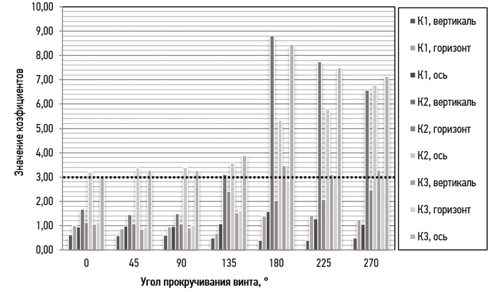- показатели коэффициентов К2 (вертикаль) и К3 (вертикаль) после выхода из области допустимых значений не снижались ниже установленного критического порога даже при дальнейшем наращивании ослабления стягивающей нагрузки. В то же время коэффициент К3 (горизонт) превысил критический порог лишь один раз, и это произошло только при максимальном ослаблении затяжки крепежного винта. Поэтому рассмотреть динамику изменения значений данного коэффициента от степени затяжки винта не представляется возможным;