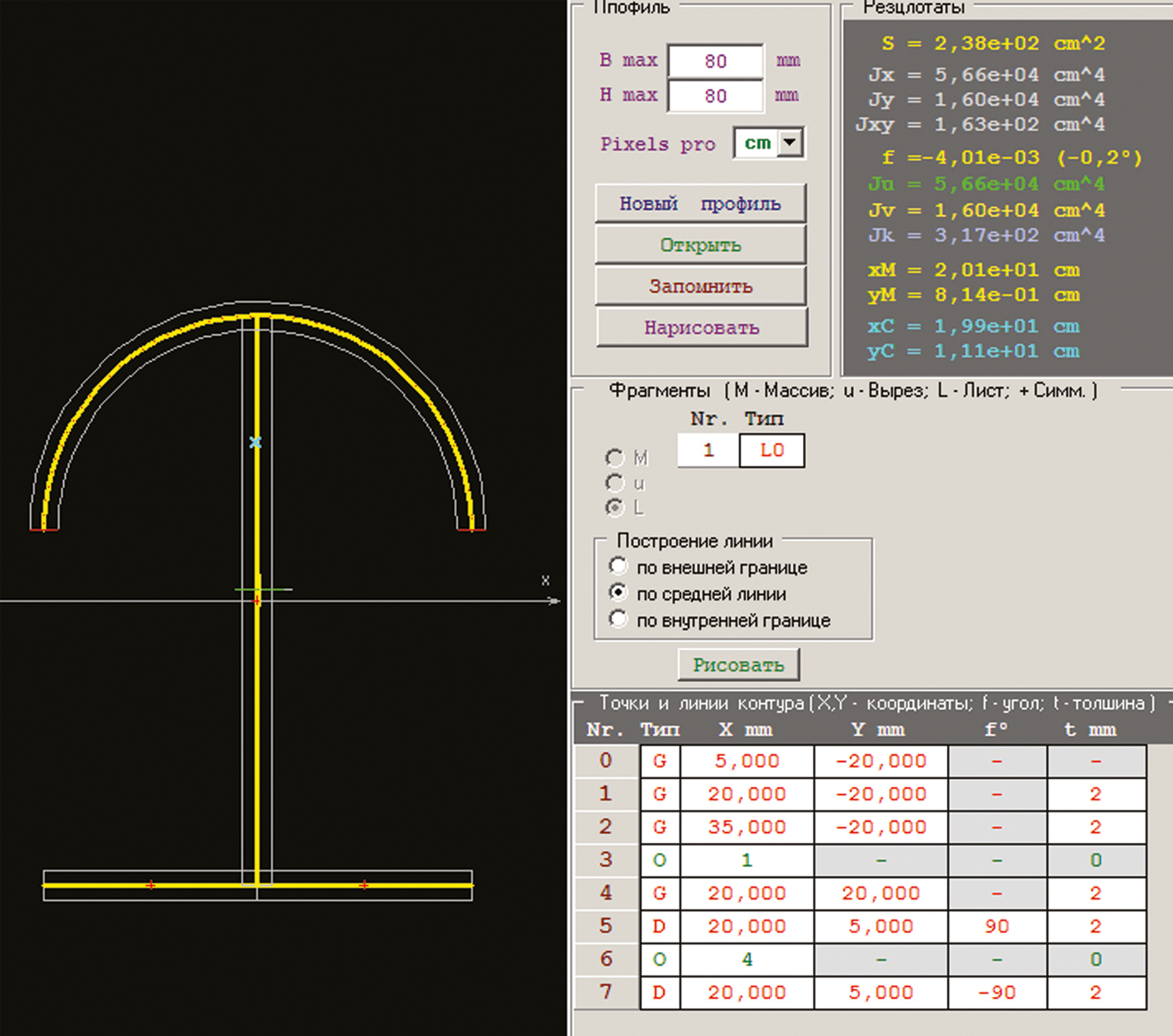 В основу программы встроен модуль конструирования поперечных сечений конструкции. Модуль позволяет создавать массивные многосвязные и замкнутые в «кольцо» или открытые (не имеющие встроенных замкнутых участков) разветвленные тонкостенные профили сечения, как прямолинейного, так и криволинейного очертания. Расчет массивных профилей проводится по рисунку сечения с разрешением 11 пикселей на единицу измерения. Число 11 выбрано в качестве компромисса между временем расчета и его погрешностью, которая составляет, как правило, менее 1 %. Предлагаемая программа предназначена для рисования (конструирования) и расчета основных характеристик массивных и незамкнутых тонкостенных прямолинейных и криволинейных поверхностей сечений.