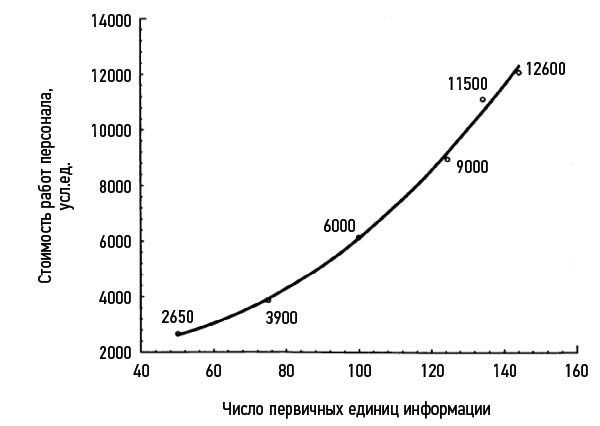 Fig. 9. Influence of the amount of processed information on labor costs when the headcount is reduced.