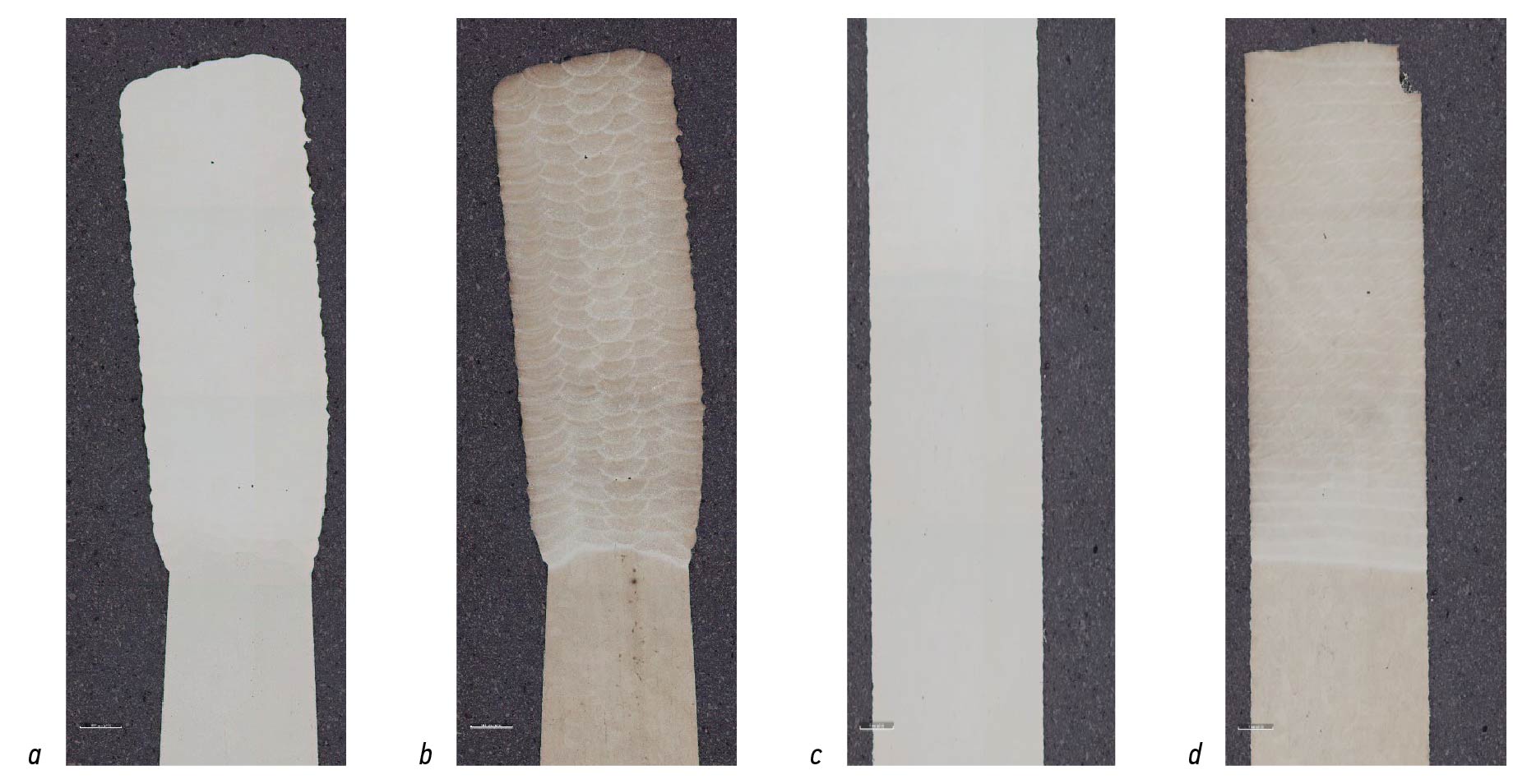 Наплавленные образцы подвергались визуальному осмотру (рис. 4) на предмет наличия/отсутствия явных дефектов (трещин, неустойчивых областей). По окончанию визуального контроля осуществлялась пробоподготовка наплавленных образцов с целью дальнейшего металлографического исследования. Полученные в рамках экспериментальных исследований образцы исследовались с помощью инвертированного металлографического микроскопа Leica DMi8A и сканирующего электронного микроскопа TESCAN MIRA 3. Макрошлифы технологических проб на разных режимах обработки представлены на рис. 5.