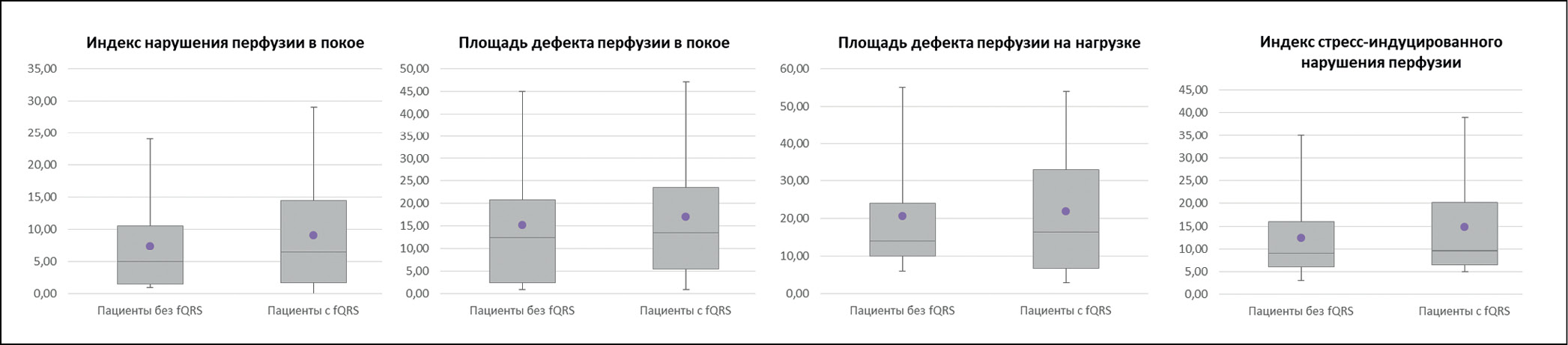 Most often, according to our data, fQRS was recorded in patients with partially reversible perfusion defects, which indicate the presence of a scar and residual ischemia in the peri-infarction zone [44]. However, we did not find a relationship between fQRS and the area of perfusion defects in patients with partially reversible perfusion defects. However, unstable cicatricial zones of the myocardium but areas with alternating zones of healthy myocardium and fibrosis are the most unfavorable for the development of arrhythmias. It can be assumed that fQRS in this case reflects the pronounced structural heterogeneity of the myocardium, regardless of the defect size, and may indirectly imply a more unfavorable prognosis.