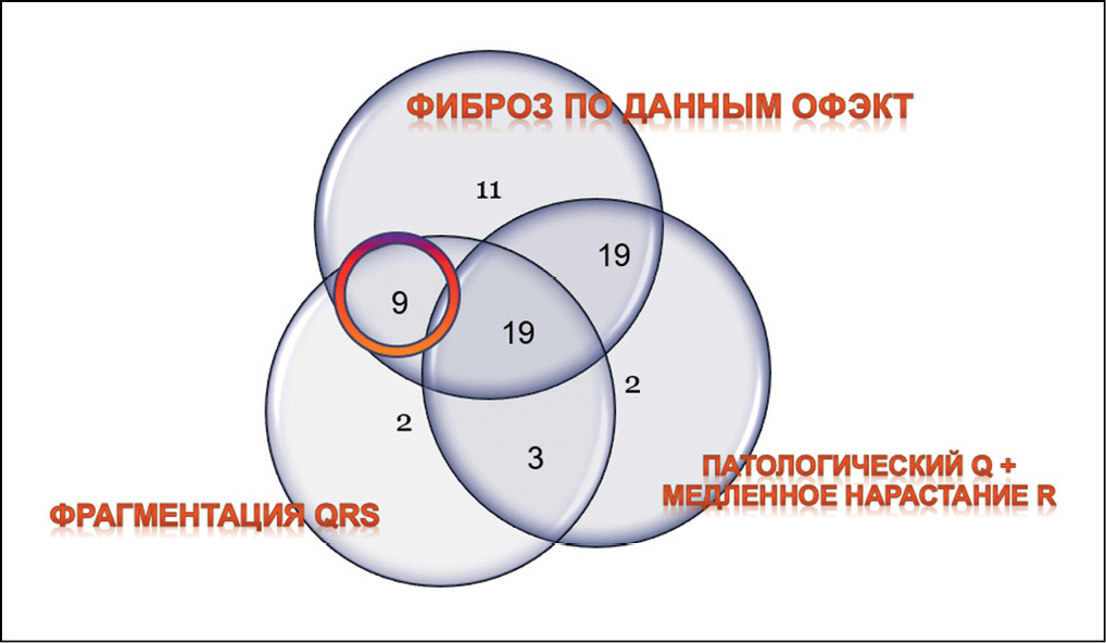 Рисунок 4. Сопоставление ЭКГ-признаков, ассоциированных с фиброзом, и наличия фиброза (рубцовых изменений) миокарда по данным ОФЭКТ