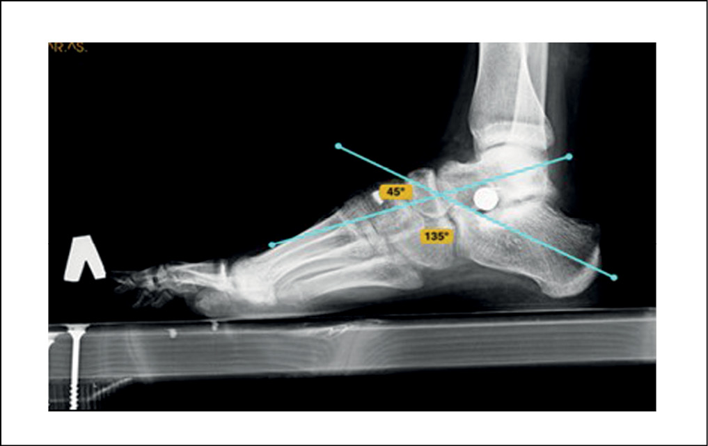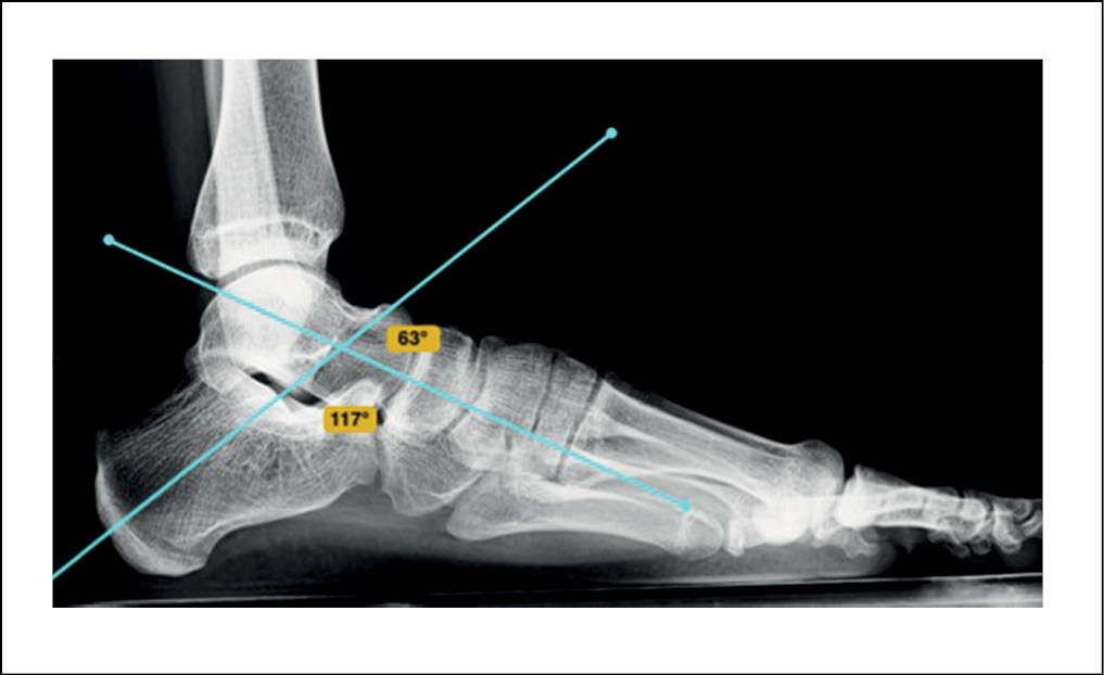 Рентгенография стоп под нагрузкой: оценивались такие показатели, как угол продольного свода стопы, который образуется пересечением двух касательных – одна к подошвенной поверхности пяточной кости, другая – к подошвенной поверхности первой плюсневой кости (в норме угол продольного свода стопы равен 125–130°, высота свода > 35 мм); угол Кайта, образованный пересечением продольных осей таранной и пяточной костей (норма 25–55 градусов); угол Meary – между первой плюсневой и таранной костью (в норме не должен превышать 4 градусов (рисунки 1, 2).