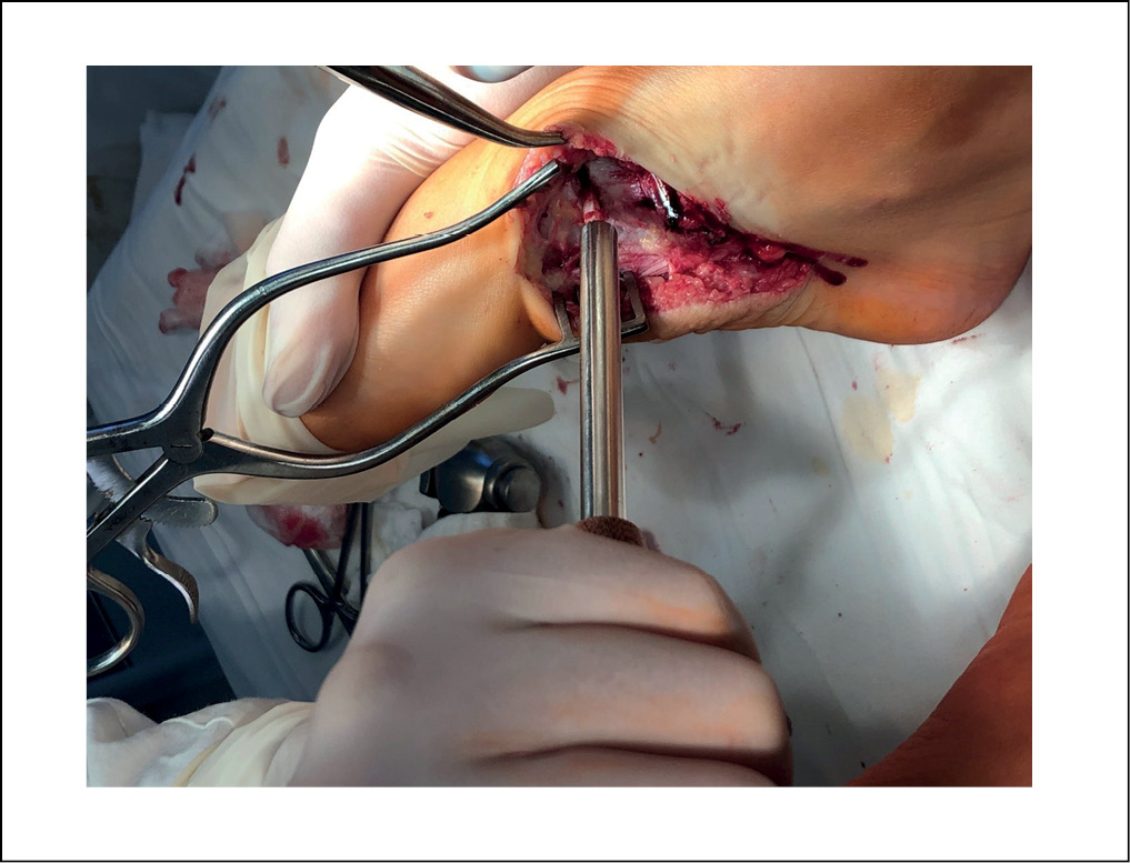 Далее по латеральной поверхности в проекции подтаранного синуса выполняли разрез длиной до 2 см, область синуса освобождали от мягких тканей и подкожно-жировой клетчатки и при помощи специализированного набора инструментов и мануальных проб оценивали размер синуса с последующей установкой подтаранного импланта под ЭОП-контролем. Эта манипуляция выполнялась для устранения вальгусного компонента деформации и коррекции заднего отдела стопы.