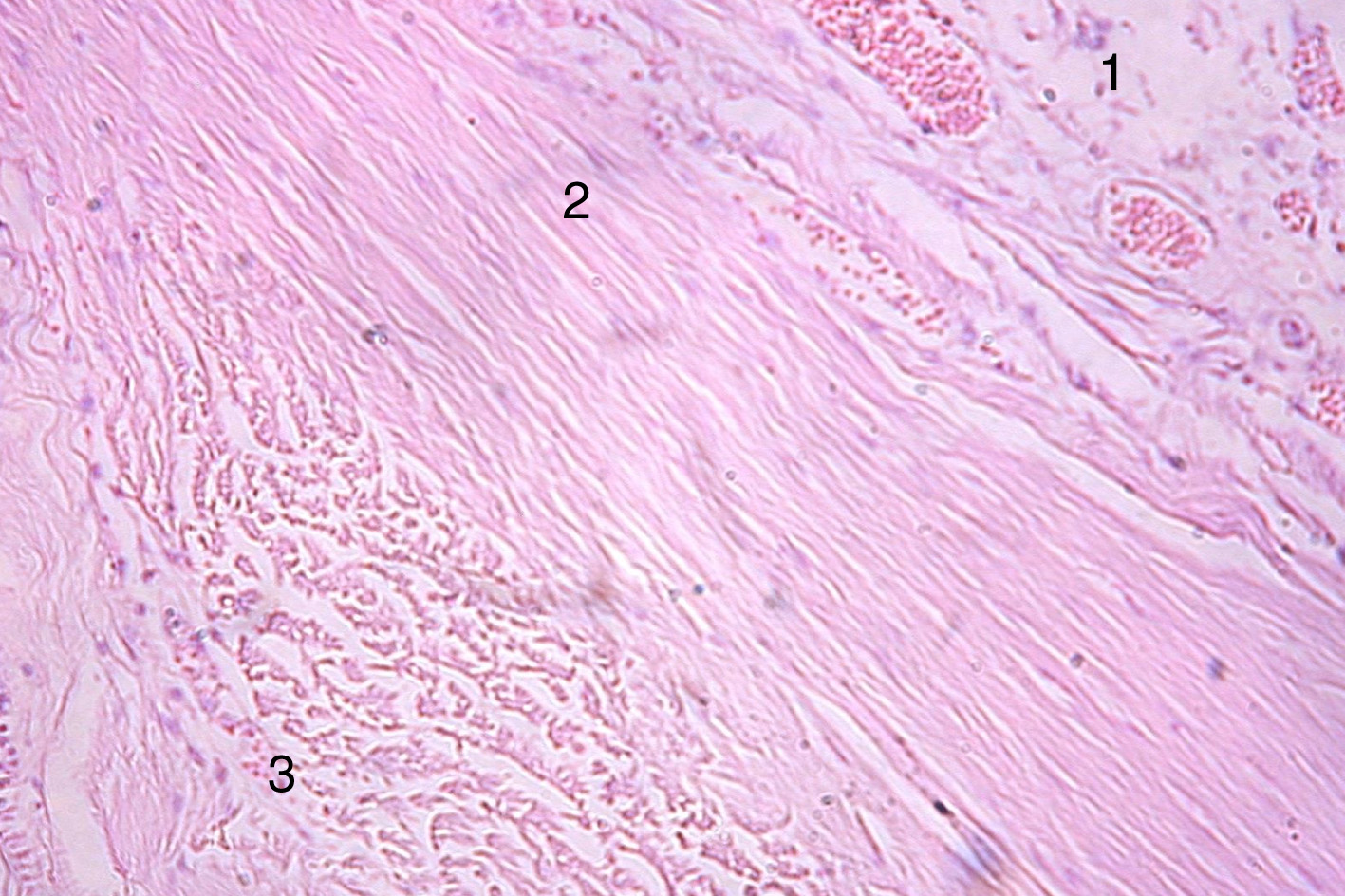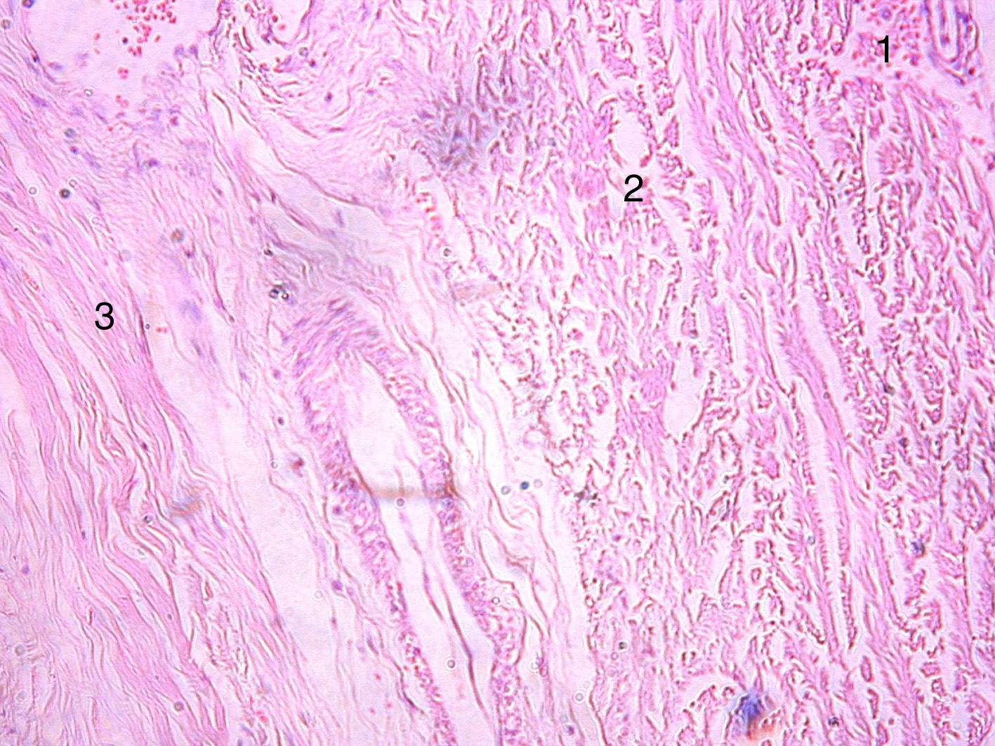 Рисунок 2. Фрагмент твердой мозговой оболочки мужчины 28 лет. Окраска гематоксилином и эозином. Увеличение 100. 1 – периостальный, 2 – менингеальный, 3 – погранично-клеточный слои.