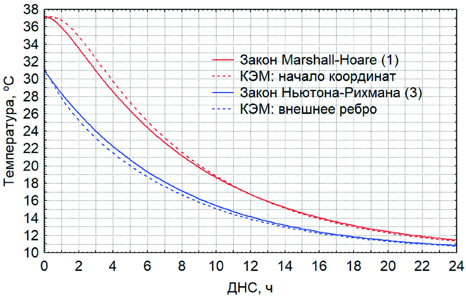 Отладку КЭМ осуществляли путем оценки сходимости кривых охлаждения, полученных с помощью КЭМ и известных математических моделей с общепризнанной валидностью. Валидной математической моделью посмертной динамики краниоэнцефальной температуры является уравнение C. Henssge, основанное на феноменологическом законе охлаждения Marshall – Hoare в условиях постоянной температуры внешней среды: