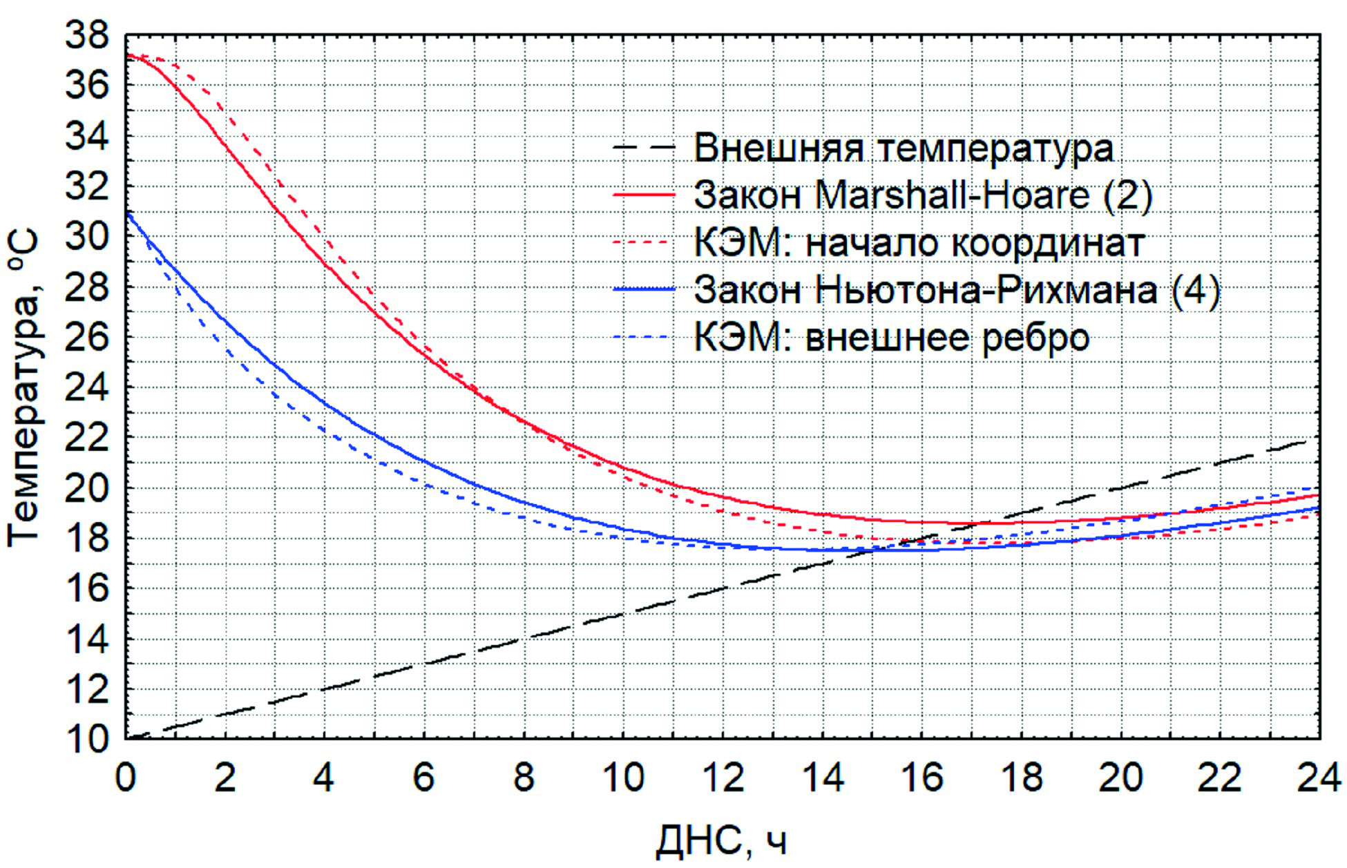 При сравнении результатов нахождения посмертного температурного поля с валидными математическими моделями установлена необходимость задания на внешнем ребре КЭМ при стандартных условиях охлаждения лишь конвективного теплообмена с воздухом при значении коэффициента теплоотдачи, равном 6 Вт/(м2·К). Таким образом, разработанная КЭМ позволяет не учитывать в расчетах радиационный теплообмен и наличие внутренних источников тепловой энергии. Данное обстоятельство является положительным качеством КЭМ, поскольку на практике очень сложно измерить суммарную плотность теплового потока от всех источников суправитальной активности, расположенных в пределах рассматриваемой геометрической модели, а также описать ее зависимость от длительности постмортального периода.