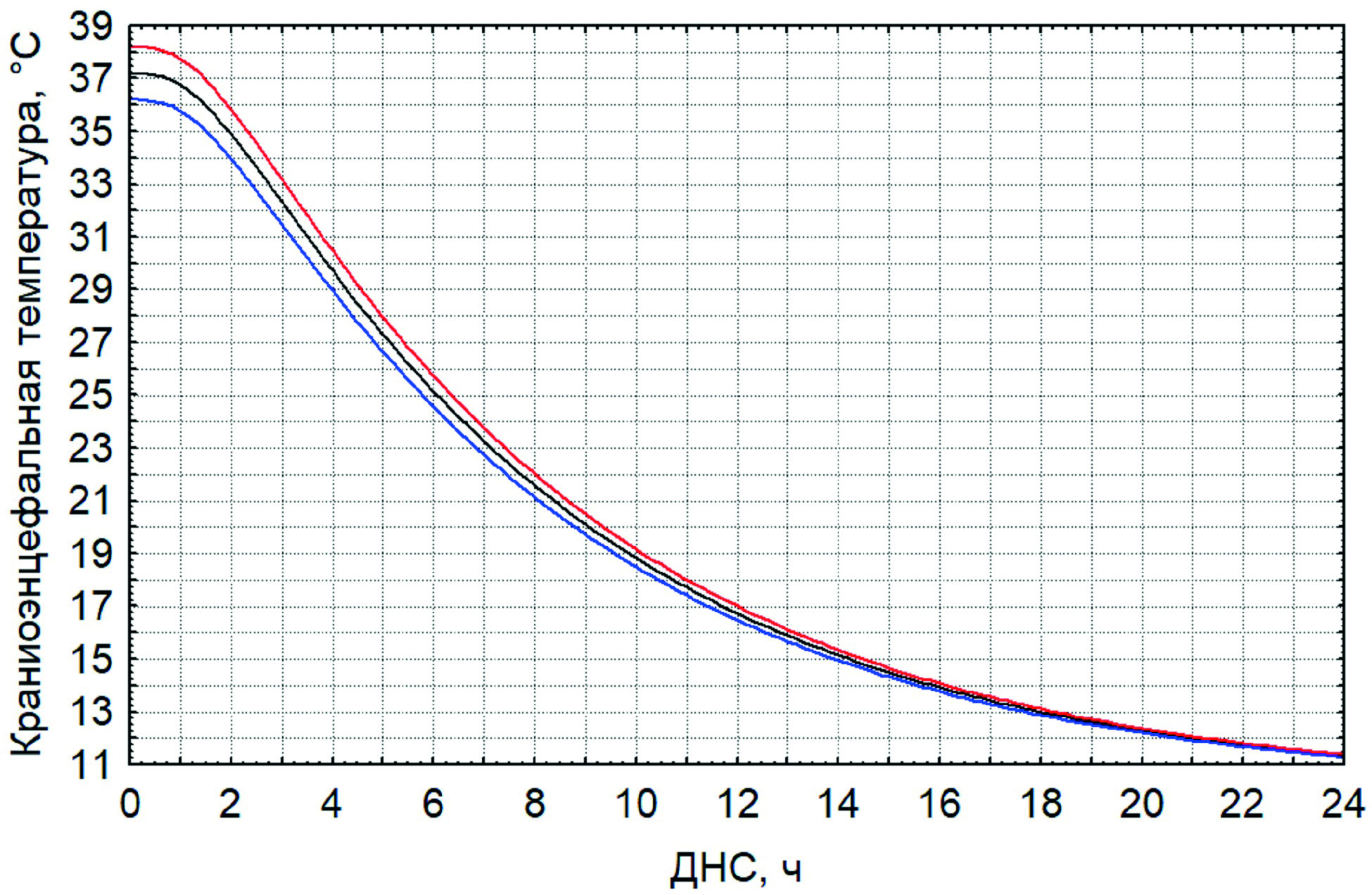 Оценка предельных погрешностей определения ДНС с помощью КЭМ может быть осуществлена путем дополнительного построения двух термограмм с заданными односторонне направленными предельными отклонениями всех актуальных теплофизических параметров. Пример подобного интервального оценивания влияния на итог определения ДНС предельных отклонений начальной краниоэнцефальной температуры от заданной в рамках КЭМ значения на 1 °С приведен на рисунке 4.