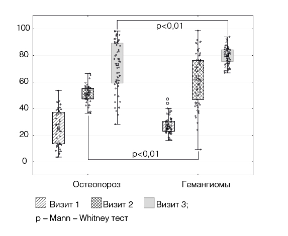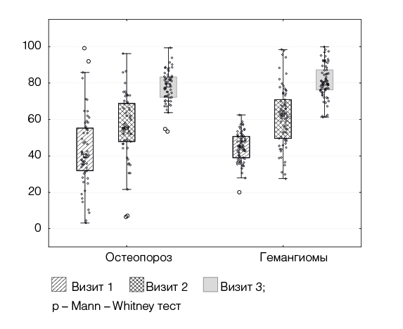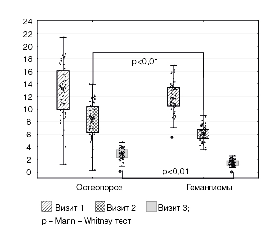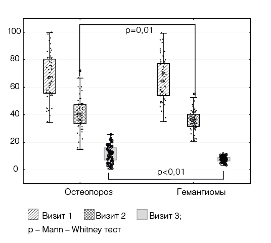 Изучены результаты исследований у 127 пациентов, которым была произведена чрескожная пункционная вертебропластика по поводу гемангиом (69 наблюдений) и остеопороза (58 больных) тел позвонков. Исследования проводили перед операцией (визит 1), на 1–2 день после операции (визит 2) и через 3–6 месяцев после операции (визит 3). Группа гемангиом была представлена пациентами в возрасте 53 [49; 62] лет, группа остеопороза – 69 [62; 74] лет.