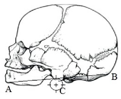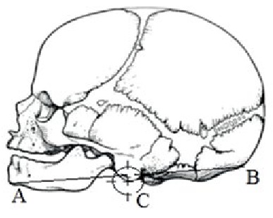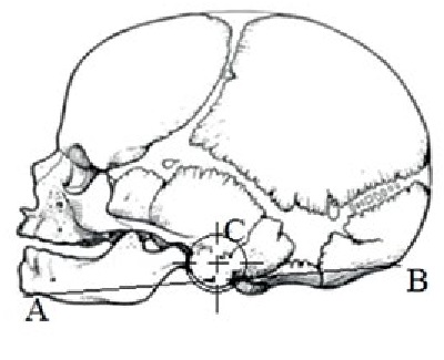 Ушная раковина в течение промежуточного плодного периода при росте плода в норме смещается вверх относительно нижней челюсти. В начале изучаемого периода ушная раковина расположена чуть ниже угла нижней челюсти. Ее центральная часть (С) находится ниже линии (АВ), соединяющей точку гнатион и наружный затылочный выступ. Перпендикуляр от условного центра ушной раковины до линии АВ составляет половина диаметра ушной раковины и в среднем равен 3,7±1,1 мм (таблица 1).