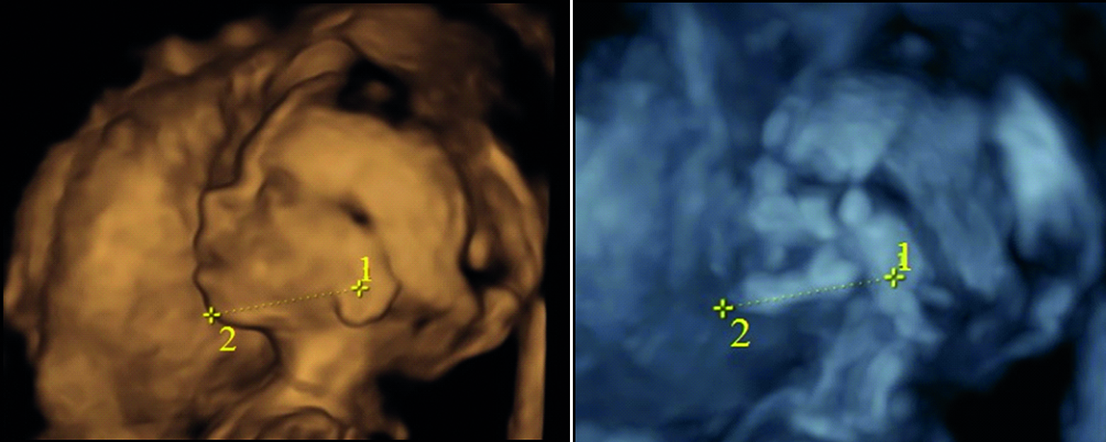 Методом ультразвукового сканирования можно изучить топографию, форму, структуры ушной раковины плода [13]. В исследовании использовались два режима: поверхностной реконструкции и костный (рисунок 1). Во всех случаях определяется условный центр ушной раковины. В костном режиме отчетливо визуализируются костные структуры, в режиме поверхностной реконструкции можно оценить форму ушной раковины и детали строения: завиток, противозавиток, козелок, противокозелок, мочку уха. Форма ушной раковины у плодов вариабельна (таблица 1).