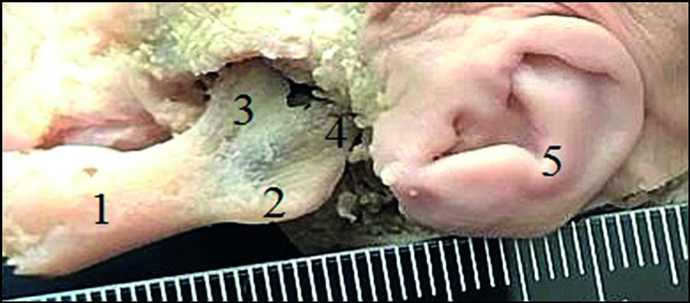 Figure 2. Macropreparation. A fragment of fetal material. Age 19 weeks, male. 1 – body of the lower jaw; 2 – angle of the lower jaw; 3 – coronoid process; 4 – condylar process; 5 – auricle.