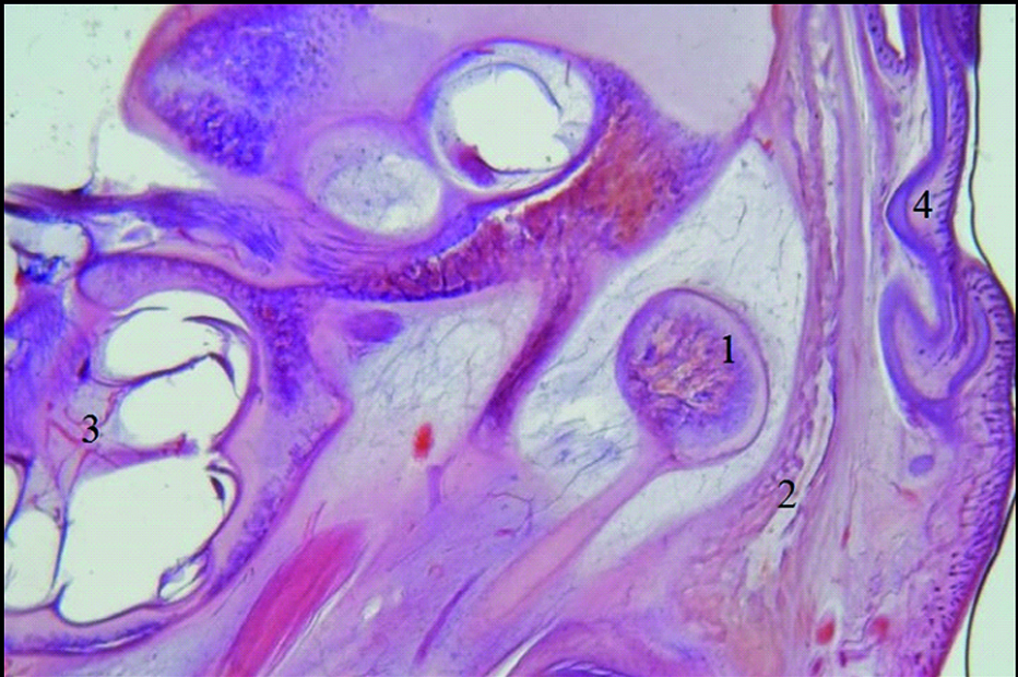 Figure 3. A fragment of the horizontal histotopogram of the lower jaw of a fetus. A microscope photo MicroOptix MX 1150, ca. 10, vol. 0.8. Age 20 weeks, gender male, stained with hematoxylin and eosin. 1 – head of the lower jaw; 2 – zygomatic arch; 3 – snail; 4 – auricle.