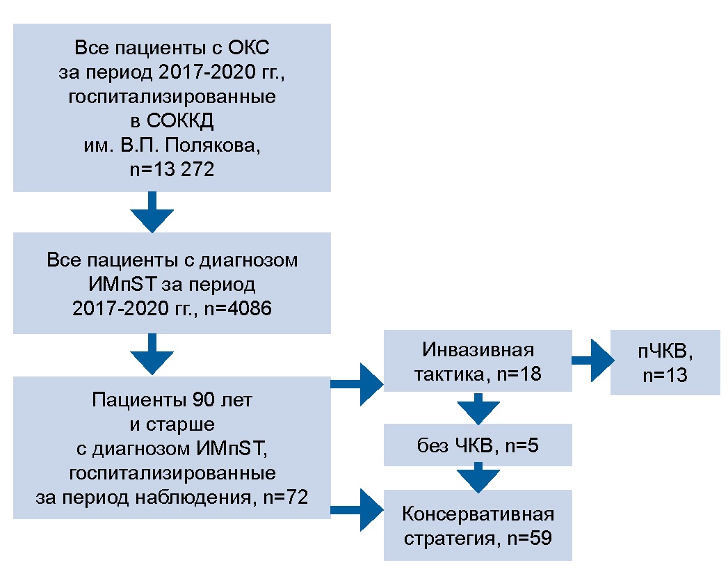 Material and methods. For the period of January, 2017 - December, 2020, in total 72 patients aged ≥ 90 were hospitalized in Samara Regional Clinical Cardiology Dispensary with STEMI: mean age 91.8 years (90-96), among them 49 women (68%). Patients were divided into two groups depending on the chosen treatment strategy. Group 1 included patients (n = 13) who underwent coronary angiography and primary percutaneous coronary intervention (pPCI), mean age 90.6 (90-91) years, 8 women (61.5%). Group 2 included patients who received coronary angiography and conservative treatment (n = 5) and only conservative treatment (n = 54), mean age 91.9 (91-96) years, 41 women (69.5%).