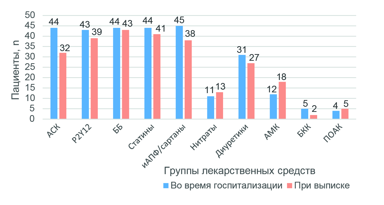 Рисунок 3. Медикаментозная терапия пациентов в стационаре и при выписке.