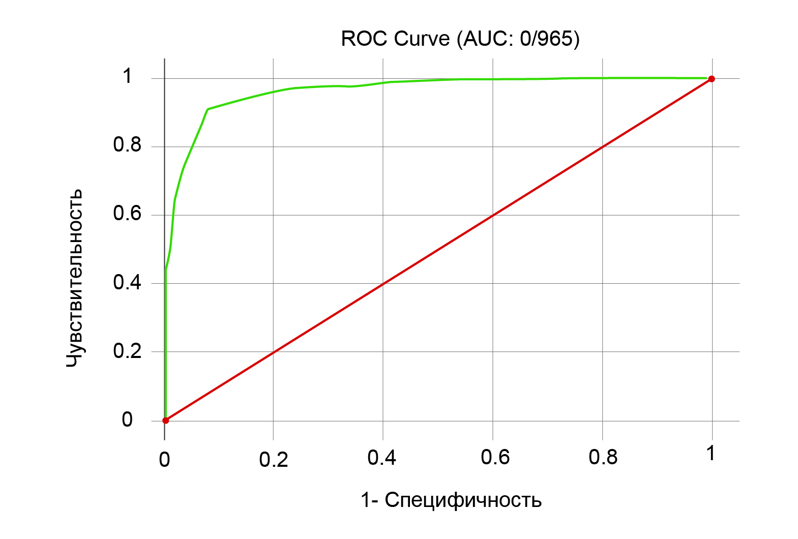 Далее на основании указанной выборки был проведен ROC-анализ на базе программы IBM SPSS Statistics. В результате показатель AUC составил 0,965, что свидетельствует о высокой прогностической ценности метода (рисунок 1).