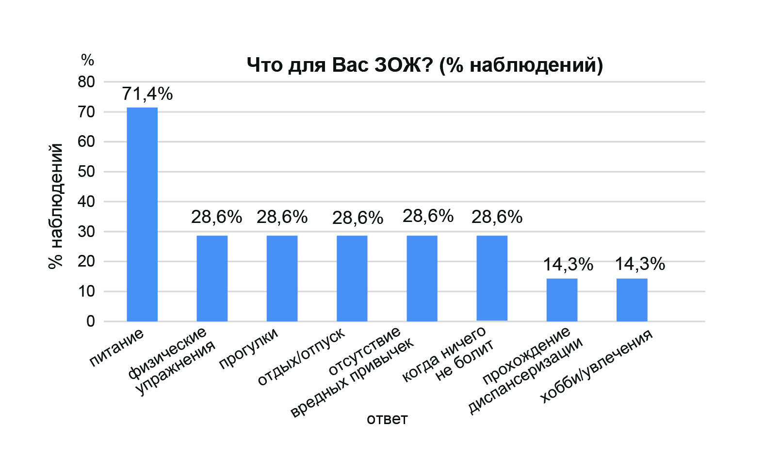 Респонденты по-разному трактуют ЗОЖ, что в целом соответствует понятию «феномен непонимания» (А.А. Боронин, 2006), когда люди воспринимают термины сквозь призму собственных приоритетов и ценностей. В нормативно-правовых актах определение ЗОЖ было закреплено в начале 2020 года, но из-за противоэпидемических мероприятий, связанных с COVID-19, оно, вероятно, не было для респондентов актуальным и «выпало» из поля их зрения [14]. Респонденты отмечают, что на продолжительность жизни, помимо ЗОЖ, влияют генетические факторы; возможность людей управлять своим здоровьем самостоятельно. Здоровье, по их мнению, является ответственностью человека. Основным мотивом для изменения поведения является страх инвалидности, потери потенции, невозможности более вести привычный образ жизни в связи с развитием заболевания.