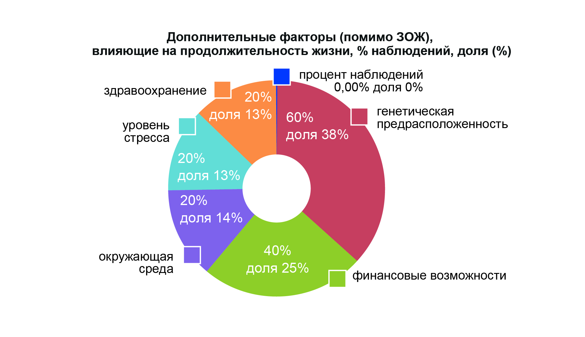 Рисунок 2. Ответы респондентов на вопрос «Дополнительные факторы (помимо ЗОЖ), влияющие на продолжительность жизни» (наблюдения, %; доля, %)