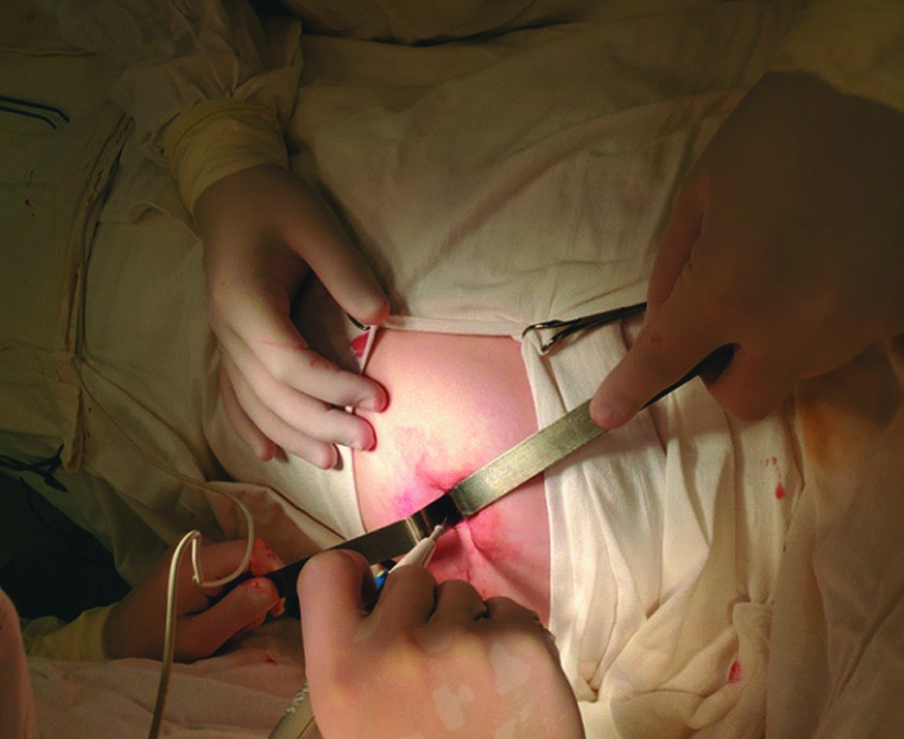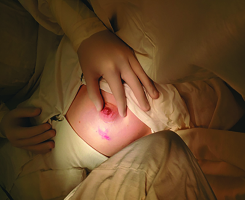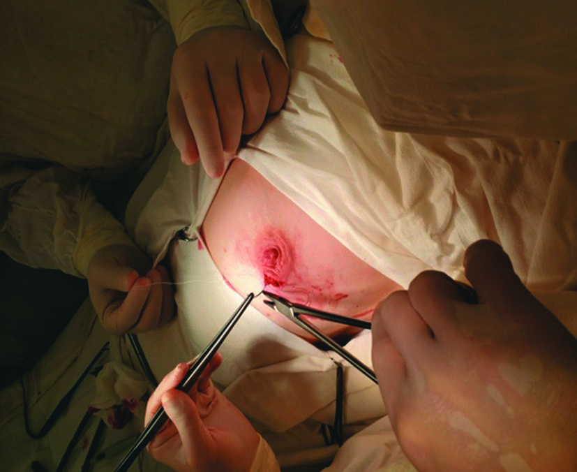 Рисунок 4. Выполнение периареолярного разреза скальпелем