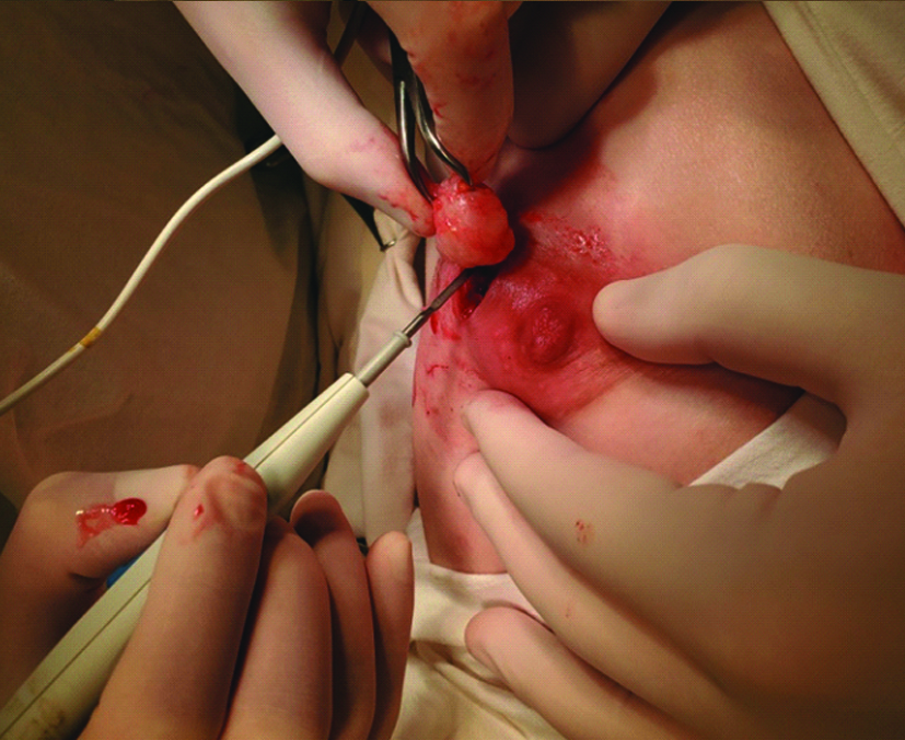 Принципиальных различий секторальной резекции молочной железы в зависимости от доступа нет. После выполнения кожного разреза подкожная клетчатка, а затем и ткань молочной железы разделялась «тупым» и «острым» путями при помощи монополярной коагуляции. В толще ткани молочной железы выделяли узловое образование и захватывали жестким зажимом. После этого осуществляли тракции за зажим. Подтягивая захваченное образование, хирург выделял, мобилизовал и иссекал его из окружающей ткани молочной железы при помощи монополярной коагуляции в пределах здоровых тканей. Гемостаз осуществляли по ходу операции монополярной коагуляцией. При необходимости в ложе удаленной ткани помещали перчаточный дренаж, который удаляли на следующие сутки. Остаточную полость ушивали рассасывающимся шовным материалом (monocril 3/0-4/0) на атравматической игле. Кожный разрез ушивали внутрикожным швом с применением рассасывающихся или нерассасывающихся нитей на атравматической игле.
