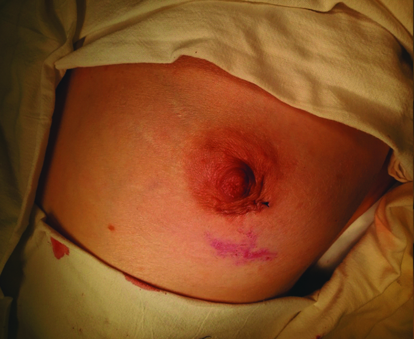 При периареолярном доступе разрез проводили четко по границе пигментированной области (ареолы), поскольку иначе можно не получить желаемого косметического результата. Протяженность разреза была не больше полуокружности ареолы (около 2 см), так как существовала опасность развития ишемии и снижения чувствительности ареолы и соска. Туннель операционного доступа во время операции никогда не был направлен в сторону соска, так как в противном случае была бы не исключена возможность повреждения млечного синуса, что повлекло бы за собой значительные нарушения лактации.