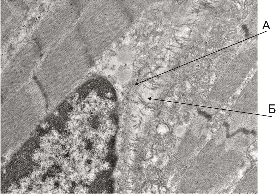 Рисунок 1. Фрагмент мышечных волокон мышцы, поднимающей задний проход. А – базальная мембрана, Б – коллагеновые фибриллы.