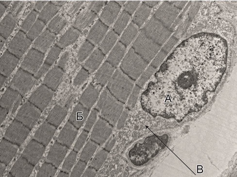 Рисунок 2. Фрагмент мышечного волокна мышцы, поднимающей задний проход человека. А – ядро миосимпласта, Б – миофибриллы, В – скопление митохондрий вокруг ядра и под сарколеммой.