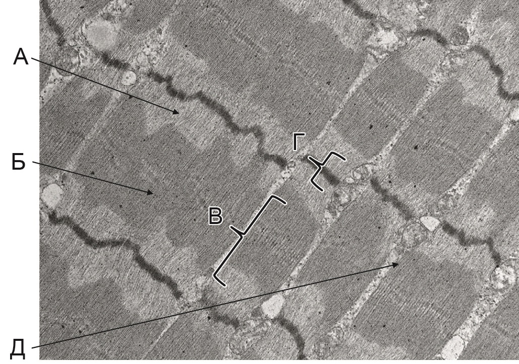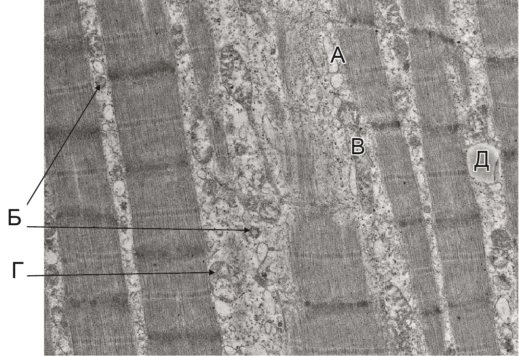 Рисунок 3. Миофибриллы мышечных волокон мышцы, поднимающей задний проход человека. А – Z-линия, Б – М-линия, В – темный диск, Г – светлый полудиск, Д – митохондрии.