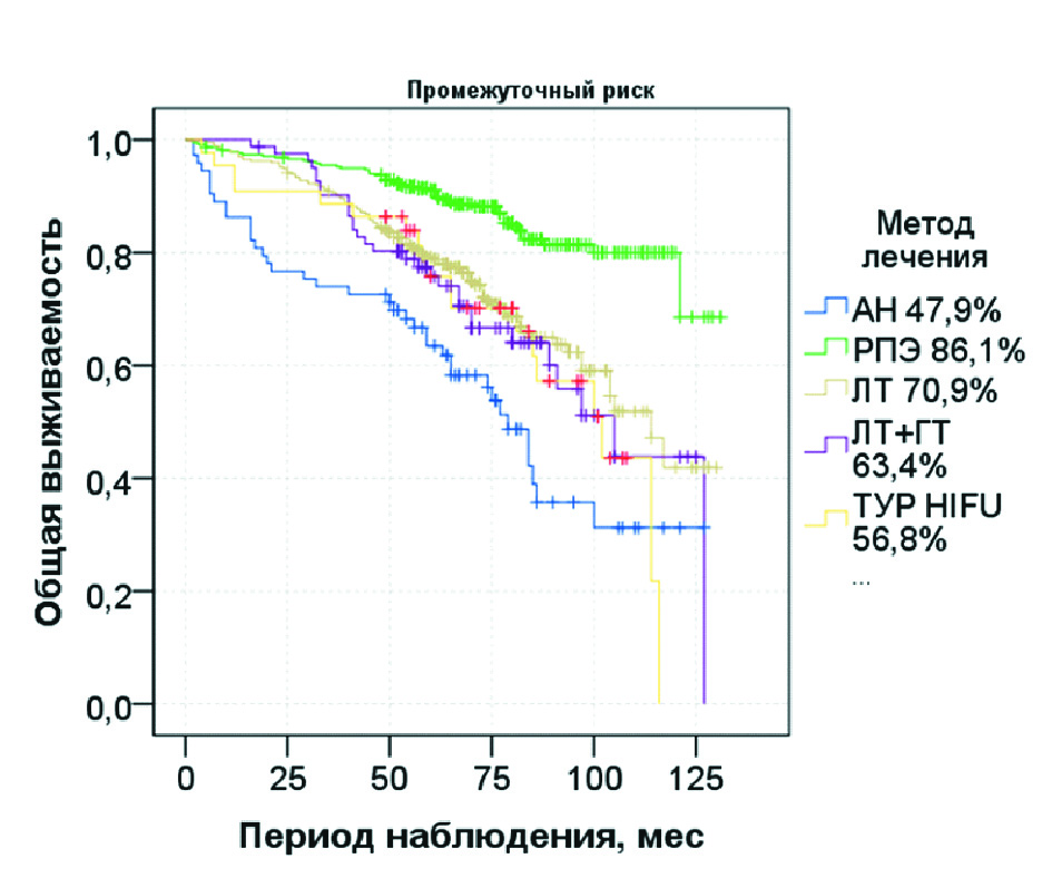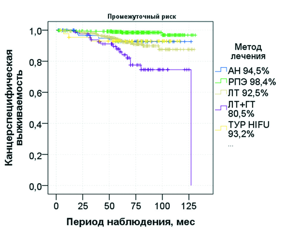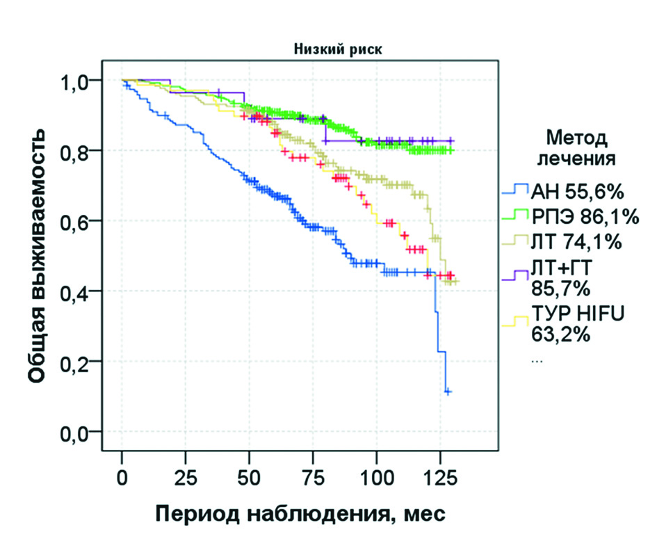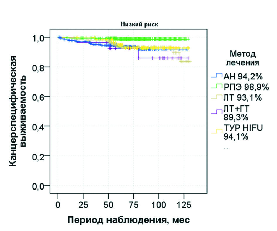 При анализе канцерспецифической выживаемости (рисунок 2) больных локализованным РПЖ низкого риска исследуемые показатели составили 94,2%, 98,9%, 93,1%, 89,3% и 94,1% соответственно. Радикальное хирургическое лечение оказалось статистически значимо эффективнее других видов лечения (рАН <0,001, рЛТ <0,001, рЛТ+ГТ =0,001, рHIFU=0,007). При сравнении значений канцерспецифической выживаемости в группе пациентов, находящихся под АН, с больными, которым проводились ЛТ и ТУР HIFU, достоверных отличий выявлено не было. Гормонолучевая терапия оказалась наименее эффективным методом лечения данной группы пациентов, что также подтверждают значения логрангового теста.