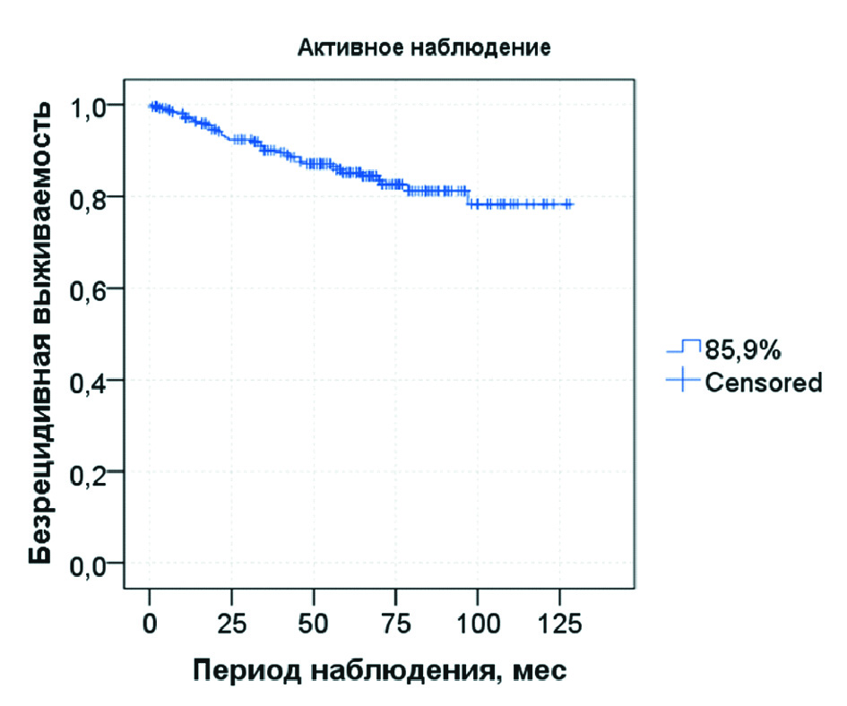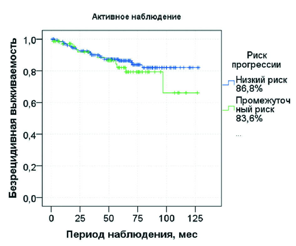 АН демонстрирует высокие результаты безрецидивной выживаемости, сопоставимые с другими методами лечения. Также не выявлено достоверных отличий при сравнении выживаемости при АН в зависимости от группы риска прогрессии.