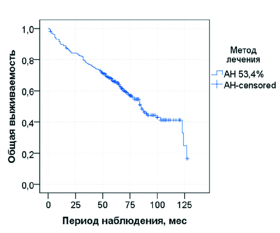 На рисунках 5–7 представлено графическое выражение функции Каплана – Мейера у больных локализованным РПЖ в группе АН. 10-летняя безрецидивная и общая выживаемость мужчин в исследуемой группе составила 85,9% и 53,4% соответственно.