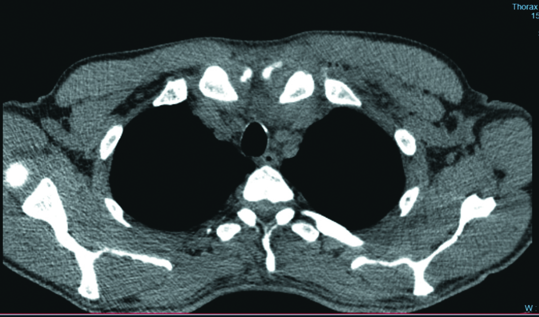 Рисунок 1. Компьютерная томограмма груди. В области левого грудинно-ключичного сочленения определяются жидкость и воздух.