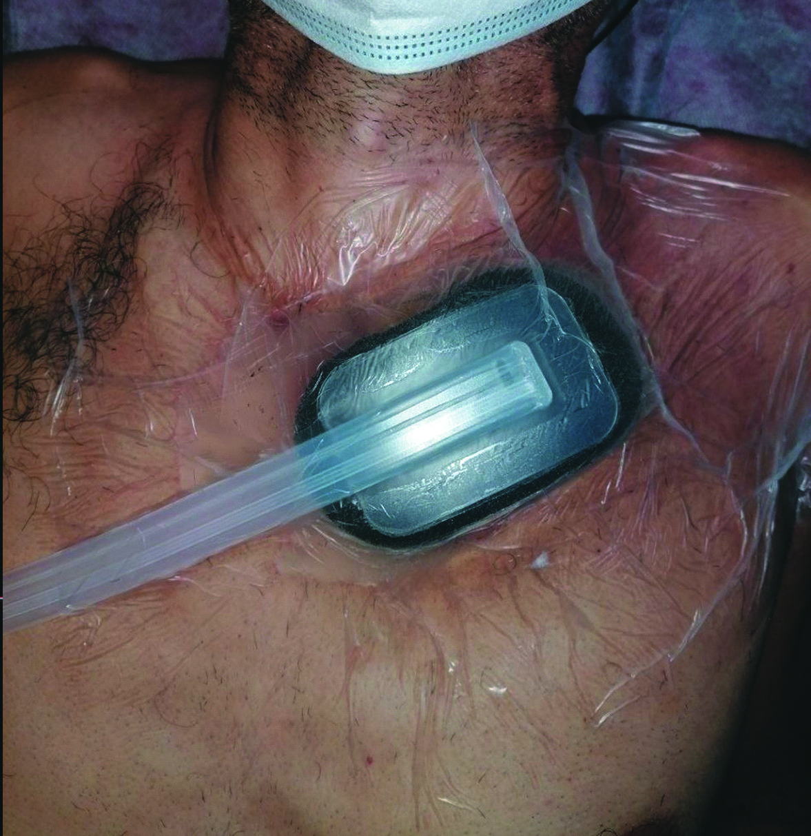 После некоторой стабилизации состояния 20.09.2022 г. больному выполнена операция – резекция левой ключицы, рукоятки грудины, I ребра слева, вскрытие переднего средостения, дренирование флегмоны грудной стенки. 21.09.2022 г. наложена вакуум-ассистированная повязка в переменном режиме с уровнями отрицательного давления -120 мм рт. ст. и -90 мм рт. ст. продолжительностью по 3 минуты каждый (рисунок 2).