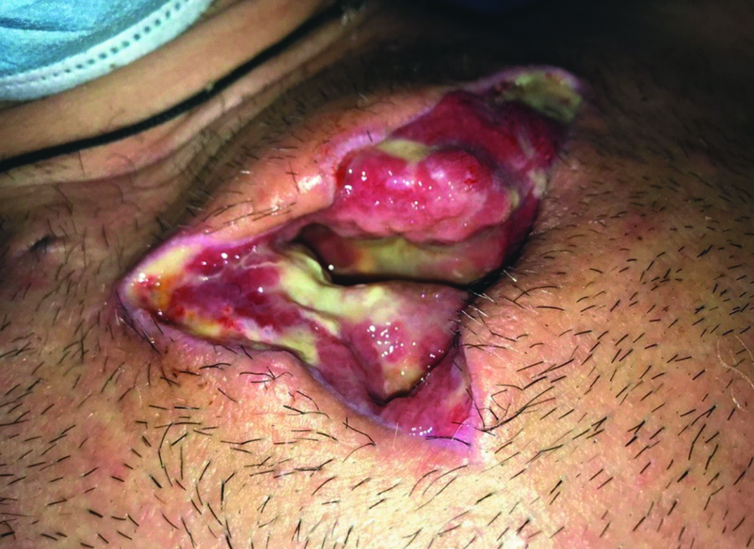 Был выставлен клинический диагноз: абсцесс левого грудинно-ключичного сочленения; сахарный диабет 2 типа. В этот же день, 15.09.2022 г., выполнена операция – вскрытие абсцесса области левого грудинно-ключичного сочленения. В послеоперационном периоде отек тканей несколько уменьшился, однако сохранялась лихорадка до 37,6°С и экссудация из раны. В анализе крови: лейкоциты – 10,1х109/л, гемоглобин 111 г/л, эритроциты – 3,6х1012/л, тромбоциты – 342х109/л, уровень С-реактивного белка 28 мг/л, глюкоза – 10 ммоль/л.
