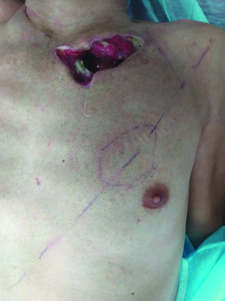 Выполнено иссечение краев раны и грануляционной ткани. При ревизии раны выявлены секвестры в области рукоятки грудины по левому ее краю. С помощью долота и молотка выполнена остеотомия рукоятки грудины. Образованный дефект имеет размеры: 14 см х 12 см, глубина 4,5 см. Дном раны является грудная фасция и париетальная плевра. В проекции левой торакоакромиальной артерии произведен разрез кожи от середины левой ключицы до III ребра. Далее на протяжении IV–VI межреберий медиально от срединно-ключичной линии сформирован овальной формы кожный лоскут, размеры которого соответствуют размеру дефекта кожи в области левого ГКС (рисунок 5).