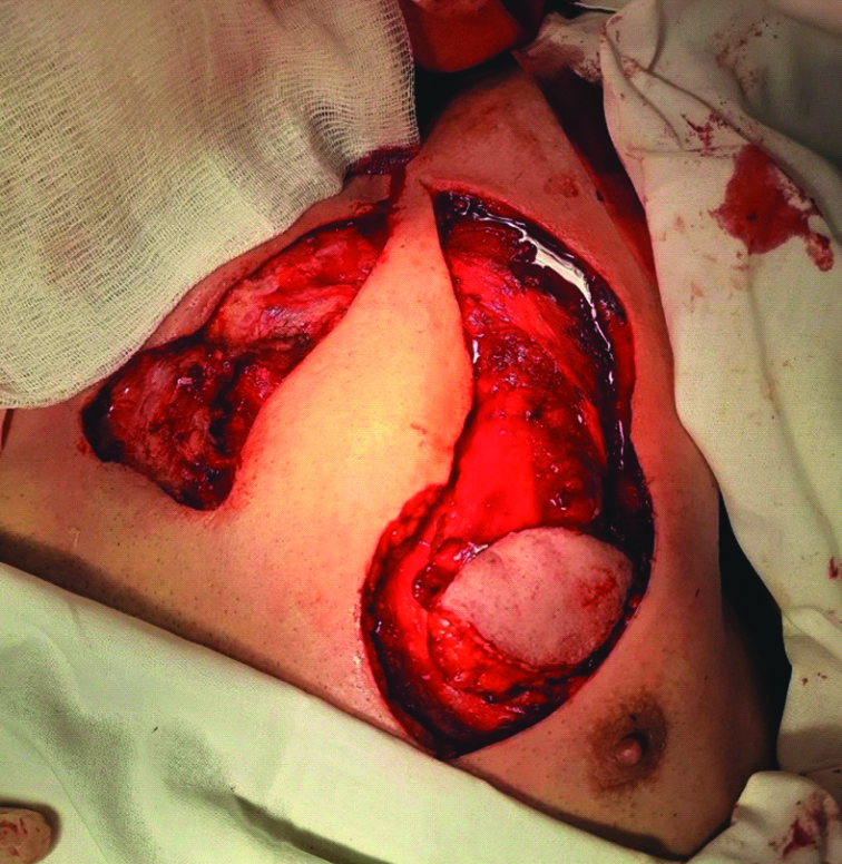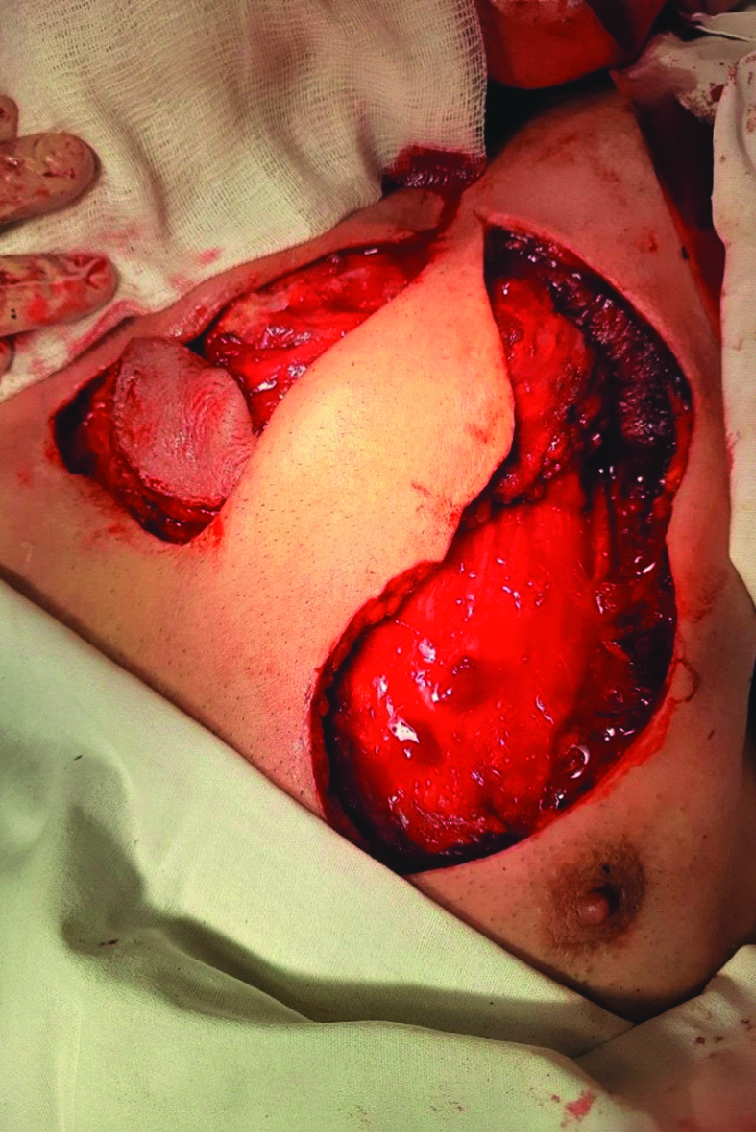 Рисунок 6. Интраоперационное фото. Сформированный полнослойный лоскут перемещен в дефект грудной стенки.