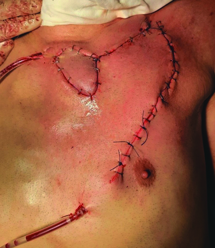 Ретропекторальное пространство дренировано перфорированной трубкой диаметром 4 мм. Края БГМ в области забора лоскута сшиты непрерывным швом рассасывающейся нитью. Наложены узловые швы на кожу. Также установлен перфорированный дренаж по Редону на дно раны грудной стенки. Мышечная часть перемещенного лоскута фиксирована узловыми рассасывающимися лигатурами к грудной фасции. Мобилизованы края раны в области дефекта. Наложен степлерный шов на кожу (рисунок 7). Продолжительность операции составила 130 минут.