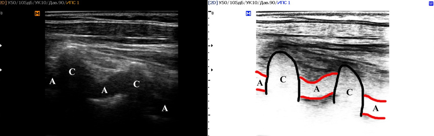 Рисунок 2. Пациент №3 А, мужчина 41 год. Пример визуализации прямолинейного хода сосудов на уровне V2 сегмента позвоночных артерий (SonoAce R7, линейный трансдьюсер).