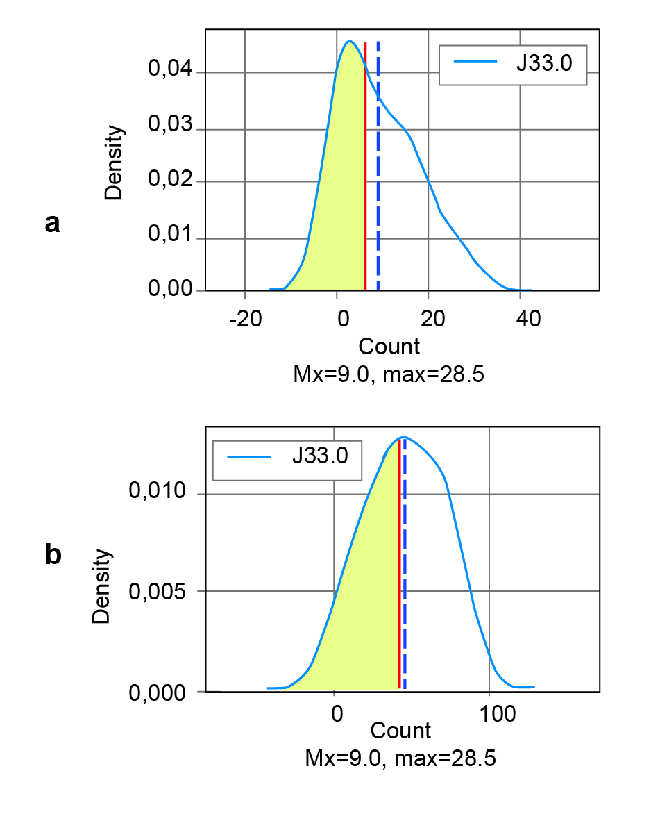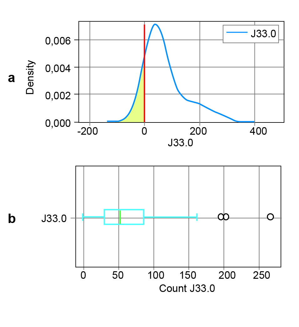 Вероятностные отклонения категориальных и счетных статистик общего периода наблюдений по районам формируют аномальные выбросы. Выбросы смещают оценки кроссируемых данных. Формируются распределения, у которых оценки средних находятся в районе процентиля 0.75% реализованной меры вероятности. Следовательно, в большинстве случаев попытки принятия гипотезы распределения окажутся неуспешными. Вопросы регрессии и прогноза будут неразрешимы. Актуальными для эксперта остаются численные таблицы и диаграммы. В качестве исключения из общего следует обратить внимание на диагноз J33.0, проявляющий себя, согласно предварительно проведенным оценкам, как самый адекватный процесс для использования вероятностных выводов и проверки гипотез при его исследовании (рисунок 1).