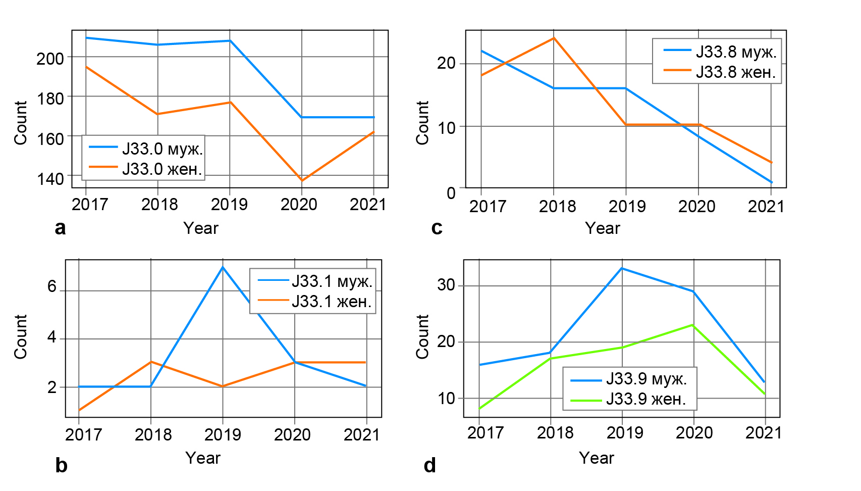 Ситуация меняется, если категории и счетчики связать с количественными данными, зависящими от некоторой хронологии. Тогда в выборках начинают проявляться характерные статистические свойства. Например, зависимости между группами, разделенные по полу (таблица 4, рисунок 2). В мужской и женской группе различен состав коррелирующих пар диагнозов заболеваний по годам (таблица 4). Особой экспертной оценки требует факт разнополярной значимой корреляции мужской и женской группами (рисунки 2b, 2c). Линейная зависимость по диагнозам в подгруппах изображена на рисунке 2. Сильная линейная зависимость у J33.0 (рисунок 2a); отрицательная зависимость J33.1 и J33.8 (рисунки 2c, 2b); J33.9 – смешанная зависимость, которая положительна только на участке 2020–2021 гг.
